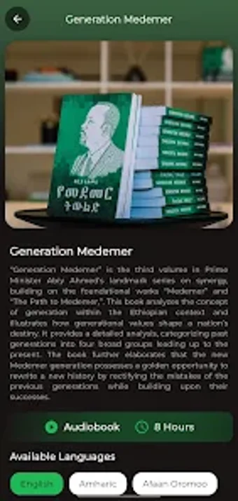 Medemer Audiobook è un'applicazione gratuita disponibile su Android, dedicata agli appassionati di audiolibri. Essa presenta tre opere significative scritte dal Primo Ministro Abiy Ahmed, disponibili in Amharico, Afaan Oromo e Inglese. Il primo libro, "Medemer", offre una visione unica che combina filosofia e politica, sottolineando l'importanza dell'unità e della sinergia per il progresso dell'Etiopia. La lettura di questo libro stimola riflessioni importanti sulla cooperazione e la prosperità del paese.